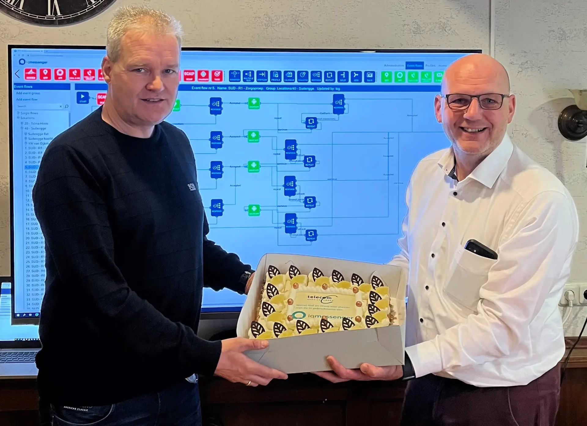 Om de livegang te vieren, heeft René Raadsheer namens Kinwell een lekkere taart aangeboden aan Jacco Tromp om de medewerkers van Hof en Hiem te trakteren.