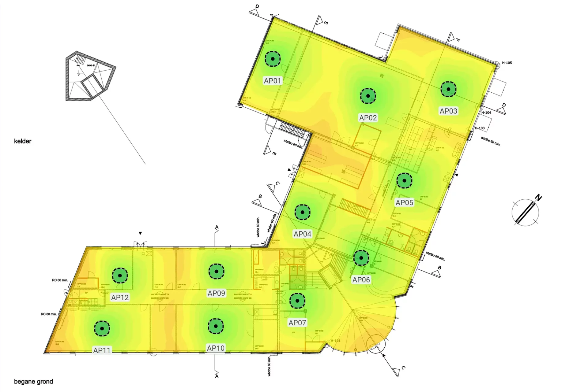 Door middel van een Wi-Fi-scan op locatie stellen we vast waar wij access points moeten plaatsen om overal goede dekking te krijgen. Afhankelijk van jouw specifieke wensen, passen wij de Wi-Fi-scan voor je aan. Wil je bijvoorbeeld lopend door je gebouw kunnen video(bellen) zonder haperingen? Dan realiseren we daarvoor een hogere dekking.